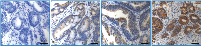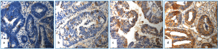 Figure 2: Detection of COX-2 expression using immunohistochemical staining. a. COX-2 with no expression; b. COX-2 low expression (Express degree, 1 score = light yellow granules, 1 score×number of positive tumour cells 25%, 1 score); c. COX-2 moderate expression (Express degree, 6 score = brown granular, 3 score × number of positive tumour cells 50%, 2 score); d. COX-2 high expression (Express degree, 9 score = brown granular, 3 score × number of positive tumour cells 95%, 3 score).