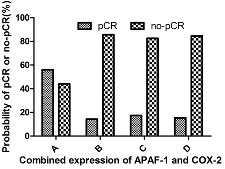 To the best of our knowledge, it is the first research to explore the predicting value of combined expression of APAF-1 and COX-2 genes in pCR to neo-CRT in patients with locally advanced rectal adenocarcinoma. Our data have demonstrated that patients with high expression of APAF-1/low expression of COX-2 would be expected to obtain the highest pCR rate (56.0%), which is significantly higher than those with other combination of their expression, which might be used to monitor pCR patients before neo-CRT.