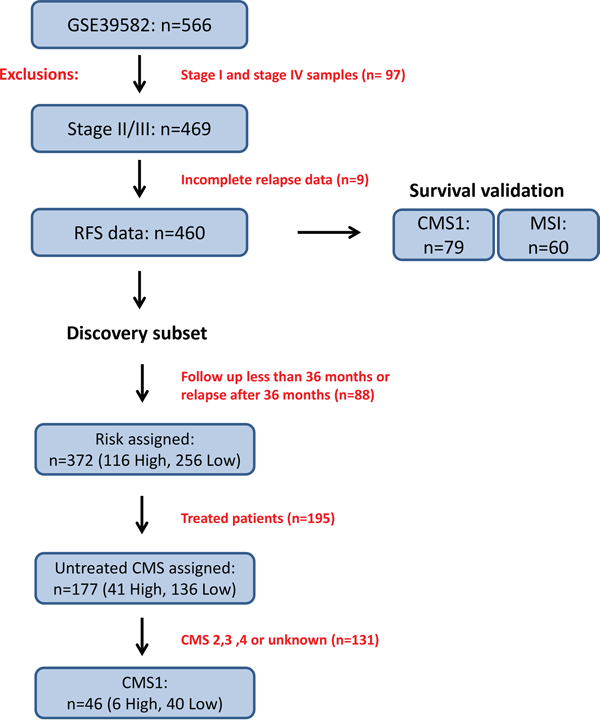 The study design and filters applied at each step are outlined in Figure 1. The entire GSE39582 cohort was filtered by excluding stage I and stage IV patient transcriptional profiles, followed by any transcriptional profiles with missing relapse data resulting in a cohort of 460 transcriptional profiles. For the discovery subset, we removed patient transcriptional profiles which were censored to follow up prior to 36 months (unknown relapse data). Patients that relapsed prior to 36 months were classified as high-risk and patients with no relapse were classified as low risk, resulting in 372 transcriptional profiles. This discovery subset was further filtered to contain only transcriptional profiles from untreated patients, resulting in 177 transcriptional profiles. Three year relapse free survival analysis was performed on these 177 transcriptional profiles to determine relapse rate information across all CMS assigned tumors using GraphPad Prism version 5 for Windows. This 177 transcriptional profile subgroup was then further filtered to contain only CMS1 assigned transcriptional profiles resulting in 46 tumor transcriptional profiles, 6 assigned as high risk and 40 with low risk assignment (Figure 1).