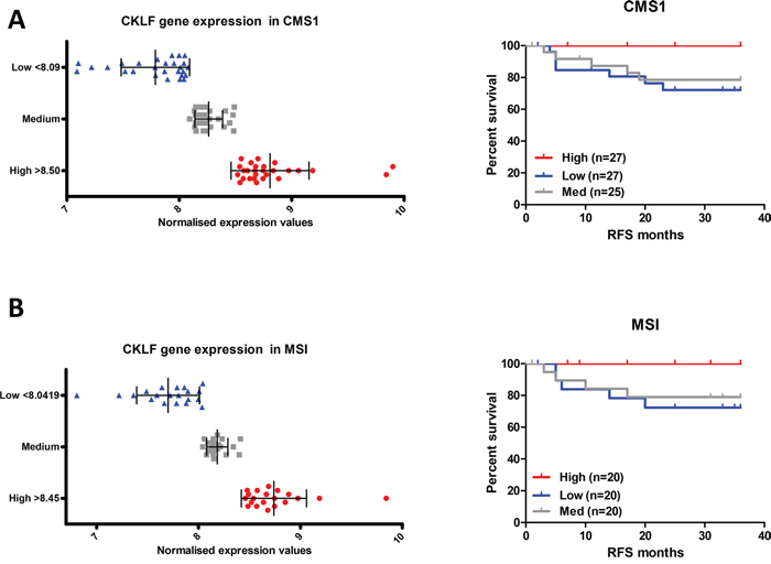 Tertile stratification was performed on the mean CKLF expression value from the three probesets used within the CMS1, MSI and complete cohorts. These values were classified as high, medium and low based on 1:1:1 sample distributions. In the case where there were uneven numbers for equal distribution, preference was given to equally distribute the high and low groups.