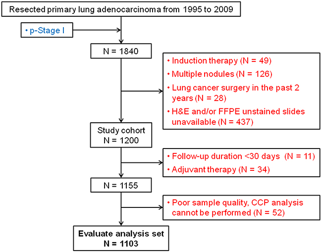 Figure 1: Disposition schematic. The evaluable analysis set included all patients who have a follow-up duration ≥30 days, did not receive adjuvant therapy, have a cell cycle progression (CCP) score, and have follow-up information. FFPE, formalin-fixed, paraffin-embedded; H&E, hematoxylin and eosin.