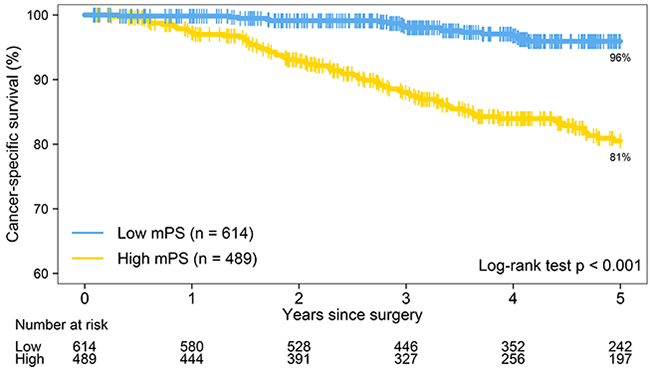 Current NCCN guidelines provide a category 2A recommendation for the use of adjuvant therapy for patients with stage IB (T2N0R0) disease with high-risk features, which includes tumor size >4 cm [35]. In our study, when a previously identified threshold was applied [17], 27% of patients (212/799) had stage IA disease and high mPS, which is a relatively higher distribution than the originally expected rate of 15%; however, the low mPS/high mPS threshold successfully stratified 5-year cancer-specific mortality, with a nearly 4-fold difference between the two (low vs high, 4% vs 15%). In comparison, in stage IB patients with tumors >4 cm, 5-year cancer-specific survival was 100% in patients with low mPS (12% of the cohort; 6/50) compared with 68% in patients with high mPS (88%; 44/50). Conversely, in stage IB patients with tumors ≤4 cm, those with a low mPS (8%; 21/254) had 5-year cancer-specific survival of 95%, compared with 79% for those with high mPS (92%; 233/254). This suggests that many patients with stage IB disease with tumors ≤4 cm, as well as a considerable number of patients with stage IA disease, may benefit from investigation of chemotherapy, in terms of improved 5-year cancer-specific survival [36, 37].