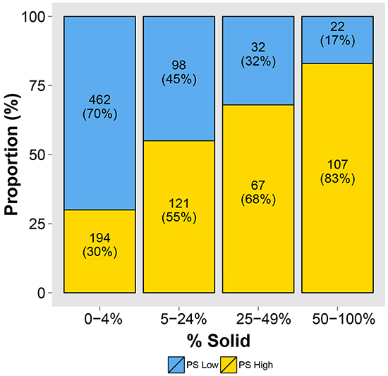 Linear association of CCP score with 5-year lung cancer–specific mortality, adjusted for clinical variables, was evaluated using Cox proportional hazards regression. The P value was based on a χ2 test statistic that was the difference of likelihood ratio statistics from models that excluded and included CCP score. Linear association of mPS with 5-year lung cancer–specific mortality was analyzed similarly. All reported P values were 2-sided. HRs with 95% CIs were reported for each interquartile range of the score distribution. The exploratory endpoint of 5-year OS was analyzed similarly. Using the log-rank test, we evaluated whether 5-year lung cancer–specific survival was significantly more favorable for patients in the low-mPS group than in the high-mPS group. The Kaplan-Meier method was used to compute survival function estimates. The relationships between high and low mPS with SOL pattern and mutation status (wild type, EGFR, and KRAS) were examined using Fisher’s exact test. All analyses were performed using SAS (version 9.4; SAS Institute, Cary, NC) and R (version 3.1.1 or later; R Core Team, Vienna, Austria).