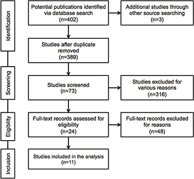 The result of literature inclusion was showed in Figure 1. A total of 405 potentially relevant articles were found, and 11 studies were included in this analysis after screening [11–16, 20, 22–25]. Most of the excluded abstracts were reviews, letters or studies with insufficient data.