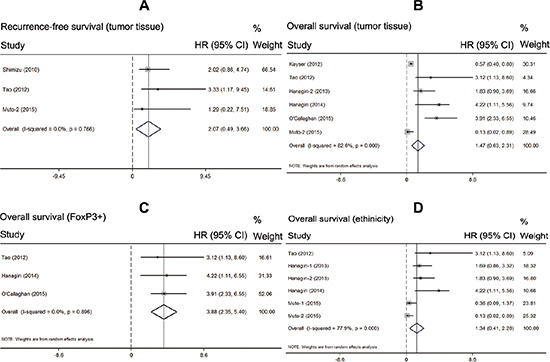 Figure 3: Subgroup analysis of the prognostic effect of Tregs. (A) meta-analysis of high Tregs infiltration and recurrence-free survival in the studies used the tumor tissue; (B) meta-analysis of high Tregs infiltration and overall survival in the studies used the tumor tissue; (C) meta-analysis of high Tregs infiltration and overall survival in the studies used Foxp3+ as the Tregs marker; (D) meta-analysis of high Tregs infiltration and overall survival by same ethnicity.