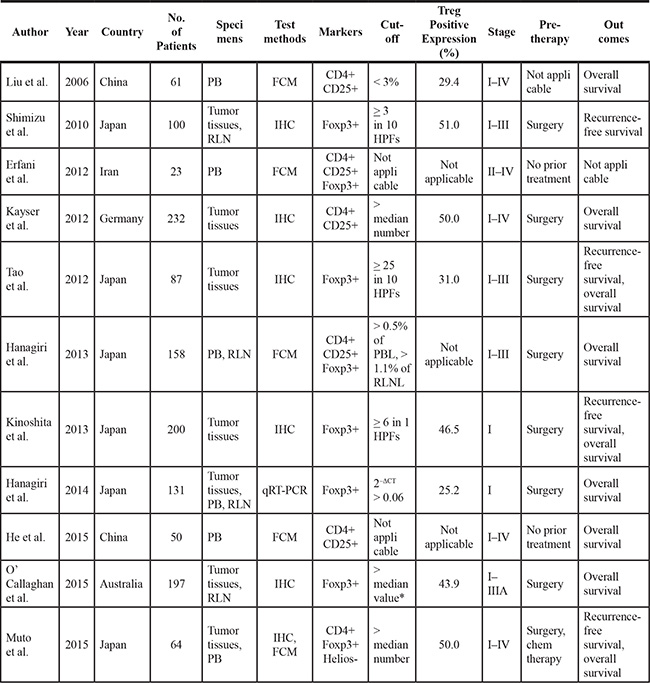 Although there has been a meta-analysis on this topic, they analyzed the prognostic value of Foxp3+ Tregs in different types of cancer and only two publications referred to NSCLC [21]. There have been more than nine papers published since this meta-analysis was conducted. Moreover, it did not perform the subgroup analysis on NSCLC and the relationship between Tregs infiltration and clinicopathological features in patients with NSCLC. For these reasons, we conducted this meta-analysis to derive a more precise estimation of the clinicopathological and prognostic significance of regulatory T cells in patients with NSCLC.