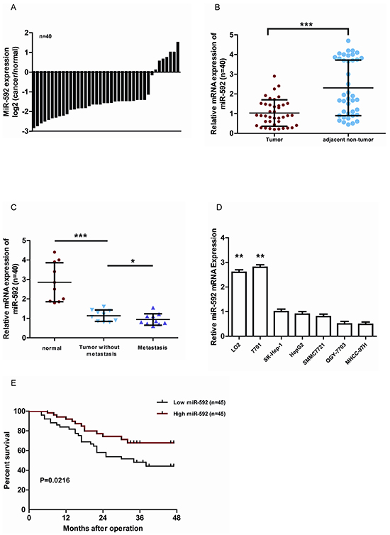 miR-592 is frequently downregulated in human HCC tissues and cell lines, which associates with low postoperative survival rate