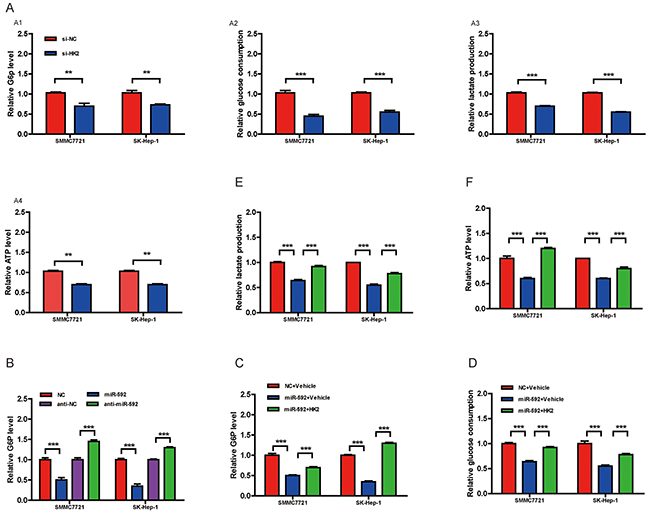 Figure 4: The miR-592/WSB1 axis inhibits glycolysis in HCC cells. A. Measurement of the cellular G6P level, glucose consumption, lactate production, and cellular ATP level in HCC cells with knockdown of WSB1 using siRNA or anti-NC as control. B. Measurement of the cellular G6P level in HCC cells with miR-592 overexpression or downregulation. Abbreviation: NC, negative control. Measurement of the cellular G6P level C. glucose consumption D. lactate production E. and cellular ATP level F. in HCC cells with overexpression of WSB1. The mean and SD of three independent experiments performed in triplicate are shown.