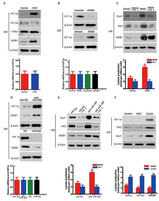 Figure 5: Knockdown of miR-592 enhances glycolysis by increasing WSB1-induced HIF-1α stability. A. Western blot shows expression of HIF-1α, HIF-2α, c-Myc in HCC tissue and normal control (left panel). Quantitative RT-PCR shows the expression levels of HIF-1α mRNA in HCC tissue and normal control (right panel). B. The protein level of HIF-1α in SK-Hep-1 cells with overexpression or knockdown of WSB1 (left panel); mRNA level of HIF-1α in HCC cells with overexpression or knockdown of WSB1 (right panel). C. Expression of glycolysis-associated proteins (HK2 and Glut1) in HCC cells treated with the HIF-1α inhibitor YC-1 or overexpression of WSB1 (left panel); lactate production in the same cells (right panel). D. The protein level (left panel) or mRNA level (right panel) of HIF-1α with overexpression or knockdown of miR-592. E. The expression of HK2 and Glut1 in SK-Hep-1 cells treated with YC-1 and/or miR-592 knockdown (left panel); lactate production in HCC (right panel). F. The effect of CoCl2 on the expression of HK2 and Glut1 (left panel), and the effects of CoCl2 on lactate production (right panel) in SK-Hep-1 cells with WSB1 knockdown or miR-592 overexpression. The mean and SD of three independent experiments performed in triplicate are shown.