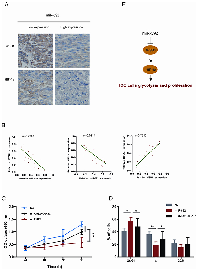 Figure 6: Clinical relevance of miR-592, WSB1 and HIF-1a expression in patients with HCC. A. Representative images of IHC staining for WSB1 and HIF-1a in HCC patients with high and low miR-592 expression. B. Correlationship between miR-592 expression and WSB1 and HIF-1a expression in HCC patients tissues. The effect of miR-592 and CoCl2 on C. SK-Hep-1 cell proliferation and D. cell cycle progression. E. Schematic diagram of the regulatory pathway from miR-592/WSB1 / HIF-1a axis to glycolysis in HCC. The mean and SD of three independent experiments performed in triplicate are shown.