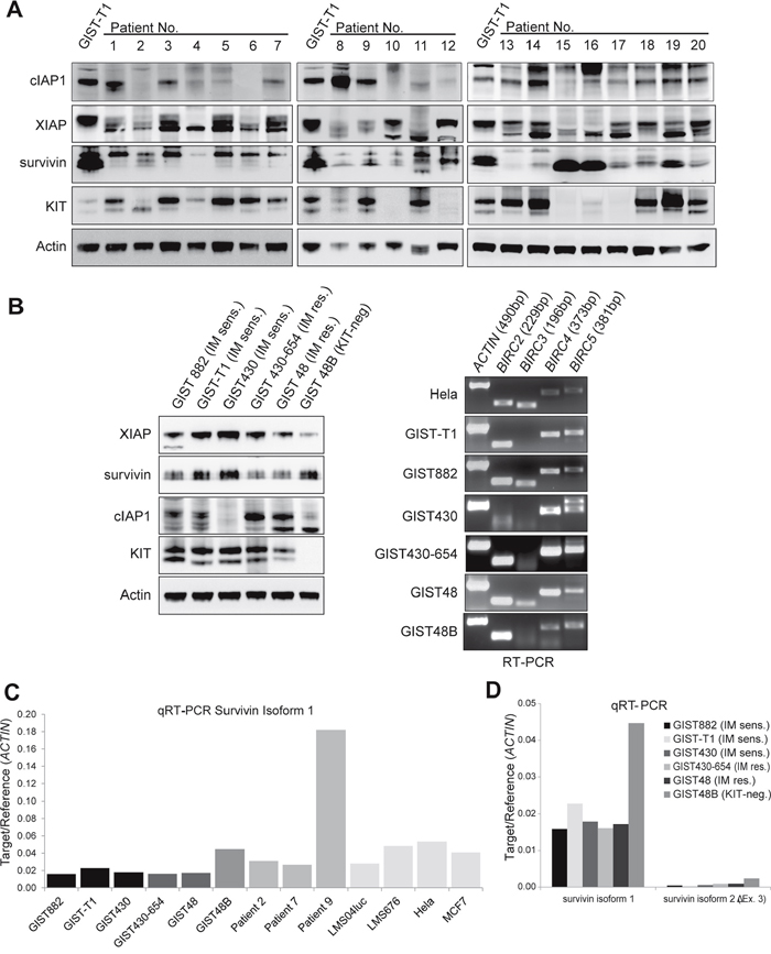 Figure 1: IAP expression in GIST primary tumors and cell lines. A. Western Blot of 20 GIST primary tumors. Expression of cIAP1, XIAP and survivin was found in 84%, 75% and 80%, respectively and the amount of IAP expression did not correlate with KIT expression levels. (Figure 1A lane 6: no lysate due to sparse tissue sample). B. IAP protein and IAP mRNA is expressed in GIST cell lines. Western blot (left panel) and reverse transcriptase PCR (RT-PCR, right panel) show high levels of XIAP and survivin protein expression. IAP mRNA (BIRC2 (cIAP1), BIRC3 (cIAP2), BIRC4 (XIAP), BIRC5 (survivin)) was detectable in all analyzed cell lines in amounts comparable to positive control (Hela cell line). C. Quantitative RT-PCR of survivin isoform 1 in GIST cell lines and primary tumors. Leiomyosarcoma cell lines (LMS04luc and LML676) and Hela and MCF7 cells were included as positive controls to correlate IAP expression levels in GIST. D. Quantitative RT-PCR of survivin isoforms 1, 2(survivin-ΔEx3) and 3(survivin-2B). sens.: sensitive; res.: resistant; No.: number. Data are represented as mean +/- SEM