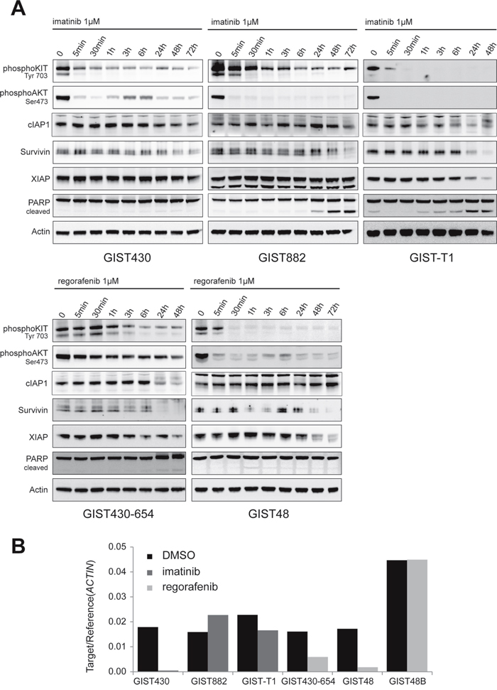 To evaluate the influence of KIT signaling on IAP regulation, imatinib-sensitive and imatinib-resistant cell lines were treated with imatinib (1μM) or regorafenib (1μM) for up to 72 hours (Figure 3). To assess KIT-independent cytotoxic effects of imatinib on IAP expression, the KIT-negative cell line GIST48B was treated with imatinib. As expected, strong inhibitory effects on KIT autophosphorylation and KIT signaling intermediates (phospho-AKT) were observed starting as early as 5 minutes. In GIST-T1, GIST430-654 and GIST882 apoptosis, as measured by PARP cleavage, was induced after 3 to 24 hours. XIAP expression decreased in GIST-T1, GIST430-654 and GIST48 but interestingly not in GIST430 and GIST882 (Figure 3A). The expression of cIAP1 protein was not changed by KIT inhibition. Survivin decreased simultaneously in all KIT-positive cell lines after 24-48 hours. In line with these findings, survivin mRNA was markedly reduced in GIST430, GIST430-654 and GIST48 (97, 63 and 90%, respectively), while there was only a 27% reduction in GIST-T1 (Figure 3B). Notably, survivin protein levels showed the latest decrease in GIST882 (72h time point) which was paralleled with an increase of survivin mRNA levels (143%). KIT-inhibitory treatment did not influence IAP protein expression and survivin mRNA in KIT-negative GIST48B (Supplementary Figure S3).