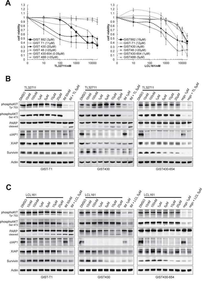 XIAP and cIAP1 were inhibited by SMAC-mimetic compounds TL32711 (TL) and LCL161 (LCL), which mimic the XIAP- and cIAP-inhibitory interaction of SMAC and IAPs to allow caspase cleavage and apoptosis [24]. Cell viability experiments with TL32711 and LCL161 displayed a differential potency in the GIST cell line panel. After six days of treatment with TL32711, IC50 values from 0.09 (GIST430) to >20μM (GIST48B) were observed (Figure 5A). Treatment with LCL161 resulted in IC50 values from 1 to >20μM with GIST430-654, 430 and GIST48B being the most sensitive cell lines (1, 4, 5μM, respectively, Figure 5A). Combinational treatment with KIT inhibitors and TL32711 showed agonistic antiproliferative effects in GIST-T1, GIST430 and GIST48 (Supplementary Figure S4). Agonistic effects of LCL161 and KIT inhibitors on cell viability could not be observed (data not shown). To assess the proapoptotic effect of single agents TL and LCL and combinations with tyrosine kinase inhibitors, Caspase Glo assays were performed. In GIST-T1 and GIST430, synergistic proapoptotic effects were observed (Supplementary Figure S5). lIn western blot experiments after 24 hours of treatment, cIAP1 expression was reduced by more than 69% (10nM) in all cell lines, whereas XIAP was downregulated by both inhibitors in GIST430 and by TL32711 in GIST430-654 and GIST882 only (Figure 5B-5C, Supplementary Figure S6). LCL161 showed the same effects on XIAP at 100 – 500 fold higher concentrations in GIST430. Survivin was downregulated by the similar concentrations of TL32711 and LCL161 (Figure 5B, 5C). Apoptosis, as measured by cleavage of PARP, was induced in all cell lines tested except in GIST48 and GIST48B. In general, KIT and KIT-dependent signaling (phospho-AKT) was not significantly affected by LCL161 (Figure 5B, 5C). Agonistic induction of PARP cleavage was observed in GIST430 and GIST-T1 (1.4- to 5.5-fold/1.0- to 10.4-fold increase compared to single agent IM and LCL/TL, respectively).
