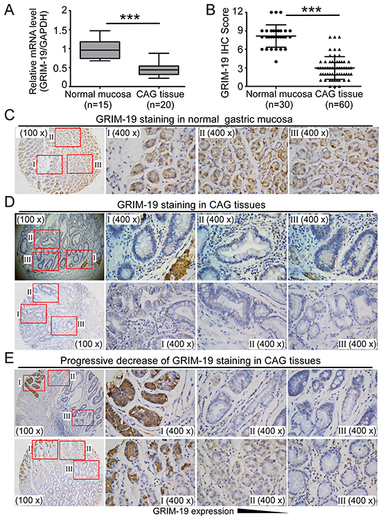 To this end, we investigated the functional role of GRIM-19 expression and its clinical implications in the pathogenesis of GC, as well as precancerous chronic atrophic gastritis (CAG). We observed that a frequent downregulation or loss of GRIM-19 in primary human GC tissues and this loss is associated with aggressive clinicopathologic features of patients with GC. In CAG tissues, GRIM-19 was also severely depressed or lost with progressive decreases in parallel with malignant transformation of CAG. Through gain- and loss-of-function strategies, we indentified an oncogenic role of GRIM-19 loss in promoting GC tumorigenesis partly by activating a STAT3-dependent pathway. Ectopic expression of GRIM-19 in human GC cells inhibited STAT3 activation and its downstream targets to induce cell cycle arrest and cell apoptosis in vitro and to suppress tumor formation in vivo. Conversely, knockdown of GRIM-19 accelerated GC cell growth in vitro and in vivo, and this was attenuated by the blockage of STAT3 activation. At the subcellular level, GRIM-19 expression exhibited subcellular redistributions characterized by peri-nuclear aggregates, cytoplasmic non-mitochondria distribution and nuclear invasion, which should be responsible for reduced STAT3 nuclear distribution. These studies collectively suggest that GRIM-19 may function as not only a potential prognostic marker of human GC, but also a prospectively therapeutic target for GC treatment.