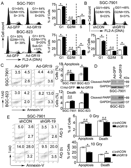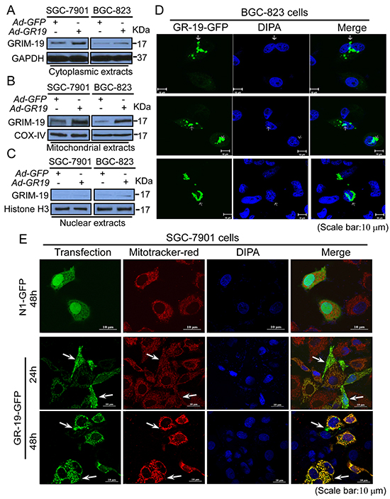 To further define the exact cytoplasmic distribution of GRIM-19 in GC cells, cells were labeled with Mitotracker-red, a specific mitochondria probe. Post-transfection 24h, GRIM-19-GFP was found to be mainly co-localized with mitochondria, but also had a dot distribution in the nucleus (Figure 6E). However, at post-transfection 48h, GRIM-19-GFP triggered peri-nuclear clustering of mitochondria, resulting in an obvious morphological change of mitochondria. Notably, we further observed a visible non-mitochondria distribution in the cytoplasm of GRIM-19-GFP transfected cells (Figure 6E). These results suggest that GRIM-19 expression can induce subcellular redistribution in GC cells.