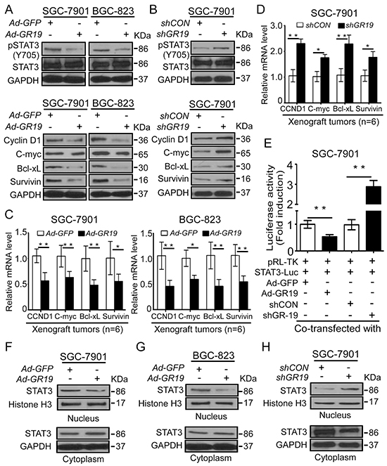Figure 5: GRIM-19 suppresses STAT3 signaling via attenuating STAT3 nuclear translocation. A. Ectopic expression of GRIM-19 decreased the expression of active STAT3 and its downstream targets in GC cells. SGC-7901 and BGC-823 were transiently transfected with Ad-GR19 and Ad-GFP for 72h, Phospho-STAT3(Try705), total STAT3 protein and its downstream targets including cyclin D1, c-Myc, Bcl-xL, and survivin were detected by Western blot. GAPDH was used as the loading control. B. Knockdown of GRIM-19 enhanced the expression of active STAT3 and its downstream targets in GC cells. SGC-7901 cells were stably transfected with shGR19 and shCON, respectively. Phospho-STAT3(Try705), total STAT3 protein and its downstream targets including Cyclin D1, c-Myc, Bcl-xL, and Survivin were detected by Western blot. GAPDH was used as the loading control. C,D. qRT-PCR for STAT3-responsive targets in xenograft tumor tissues. Xenograft tumors were established using indicated cells. STAT3-responsive genes were measured using qRT-PCR in xenograft tumors from GRIM-19-expressing GC cells (C) and GRIM-19-knockdown GC cells (D). GAPDH was used as internal control. Data are presented as mean ± SD. E. GRIM-19 repressed STAT3 transcriptional activation. GC cells were transiently transfected with the indicated reporter constructs along with shRNA plasmids or GRIM-19 expression vectors, respectively. pRL-TK Reniila plasmid was co-transfected to normalize transfection efficiency. At 24 h after transfection, the luciferase activity was quantified by dual luciferase assay. The data were presented as fold inductions of the ratio was normalized to Renilla luciferase activity. F,G,H. GRIM-19 inhibited STAT3 nuclear translocation. GC cells were transfected with indicated vectors. STAT3 expression was detected by Western blot from cytoplasmic and nuclear extracts in GRIM-19 expressing SGC-7901 cells (F), GRIM-19 expressing BGC-823 cells (G) and GRIM-19 knockdown SGC-7901 cells (H). GAPDH (for cytoplasmic protein) and Histone H3 (for nuclear protein) were used as loading control. *p<0.05, **p<0.01 between the indicated two groups determined by paired student’s t test.