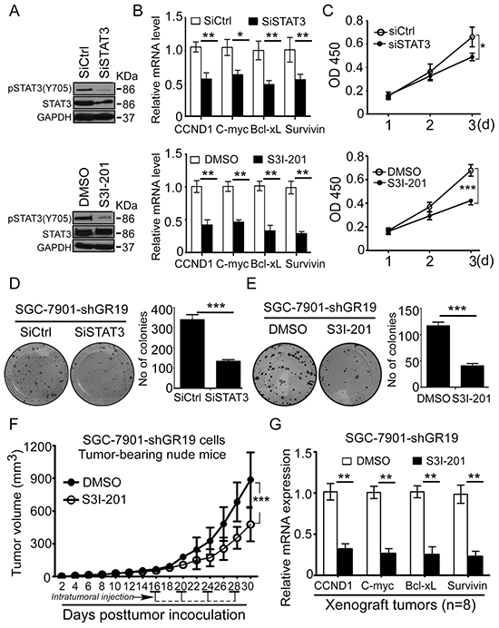Figure 7: Blockage of STAT3 activation reverses GRIM-19 loss-driven tumor growth in vitro and in vivo. A,B. Inhibition of STAT3 reduced GRIM-19 loss-induced STAT3 activation and STAT3-responsive genes expression. SGC-7901-shGR19 cells were treated with a pool of STAT3 siRNAs (siSTAT3) or STAT3 inhibitor S3I-201. Phospho-STAT3(Y705) and total STAT3 protein were detected by Western blot (A) and STAT3-responsive targets were analyzed with quantitative RT-PCR (B). GAPDH was used as an internal control. C, D, E. Abrogation of STAT3 activation reversed GRIM-19 loss-driven cell proliferation and colony formation in vitro. SGC-7901-shGR19 cells were treated with siSTAT3 or S3I-201. Cell viability was detected by WST-1 assay at absorbance 450nm for 3 consecutive days (C) and colony formation ability was determined by colony formation assay (D, E). Data are presented as mean ± SD of 3 independent experiments. Representative images of colonies formed are shown. F, G. Inhibition of STAT3 activation reversed GRIM-19 loss-derived tumorigenesis in vivo. Xenograft mouse models from SGC-7901-shGR19 were established as described in Materials & Methods. When tumor volumes had reached approximately 50 mm3, Mice (n=8 mice/group) were intratumorally injected four times with or without S3I-201, and tumor volume was calculated every two days (F). After indicated time, STAT3-responsive targets in excised xenograft tumors were analyzed using quantitative RT-PCR (G). Data are presented as mean ± SD. * p<0.05, ** p<0.01 and *** p<0.001 between the indicated two groups determined by paired student’s t test.