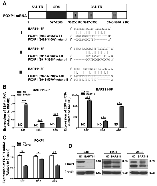 Figure 1: FOXP1 is a direct target of EBV-miR-BART11. A. Three binding sites of EBV-miR-BART11-3p and EBV-miR-BART11-5p were predicted in the FOXP1 3’-UTR, including 3082 bp-3106 bp (I), 3917 bp-3998 bp (II), and 5943 bp-5970 bp (III). Wild-type (FOXP1-WT) and mutant (FOXP1-mutant) sequences were used to validate these predictions. B. The expression of exogenous EBV-miR-BART11-3p (left) and EBV-miR-BART11-5p (right) was detected by qRT-PCR. FOXP1 C. mRNA and D. protein expression levels in 5-8F, HK-1, and AGS cells after EBV-miR-BART11 treatment. β-actin served as loading control. E. Luciferase reporter assay, using reporter vectors containing either wild-type (FOXP1-WT) or mutant (FOXP1-mutant) FOXP1 3′-UTR, and EBV-miR-BART11 or non-targeting control, was performed in order to identify the direct binding of EBV-miR-BART11 to the FOXP1 3′-UTR in 5-8F cells. F. EBV-miR-BART11 and FOXP1 expression levels in NPC and control specimens were detected by qRT-PCR. N, non-tumor nasopharyngeal epithelium (n = 10); T, NPC (n = 30). Representative images or data expressed as mean ± SD of the measurements obtained in three separate experiments are presented (ND: not detected; *p < 0.05; **p < 0.01;***p < 0.001).