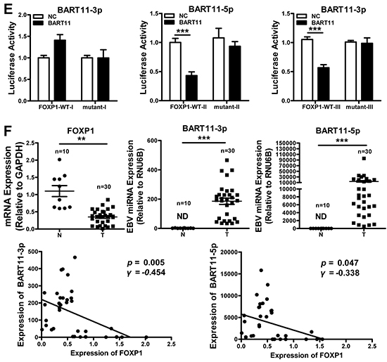 To explore the relationship between EBV-miR-BART11 and FOXP1, EBV-miR-BART11-(3p and 5p) and FOXP1 mRNA expression was assessed in 30 NPC biopsies and 10 non-tumor nasopharyngeal epithelial tissues. As expected, EBV-miR-BART11-3p and EBV-miR-BART11-5p expression levels were significantly higher in NPC samples than in normal nasopharyngeal epithelial samples, and these levels were negatively correlated with FOXP1 expression (p < 0.05, Figure 1F).