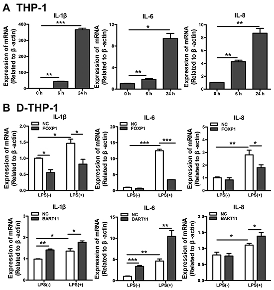 Figure 3: EBV-miR-BART11-transfected macrophages are hyperresponsive to LPS. A. Pro-inflammatory cytokine (IL-1β, IL-6, and IL-8) expression in PMA-treated THP-1 cells. B. Differentiated THP-1 (D-THP-1) cells, stimulated with LPS in the presence of exogenous FOXP1 overexpression (upper panel) or EBV-miR-BART11 (lower panel). Data are expressed as mean ± SD of the results obtained from each group of cells in three separate experiments (*p < 0.05; **p < 0.01; ***p < 0.001).