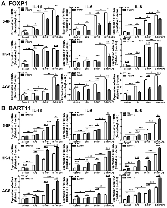 Figure 4. Effect of FOXP1 and EBV-miR-BART11 expression on the local inflammatory response in epithelial cells. The expression of inflammatory factors (IL-1β, IL-6, and IL-8) , measured in 5-8F and HK-1 NPC and AGS GC epithelial cells transfected with FOXP1 overexpression vector A. or EBV-miR-BART11 precursor vector B. and treated with LPS or conditioned media collected from the untreated differentiated-THP-1 cells (D-THP) or LPS-treated D-THP-1 cells (D-THP-LPS). Data are represented as mean ± SD of three independent experiments. *p < 0.05; **p < 0.01; ***p < 0.001.