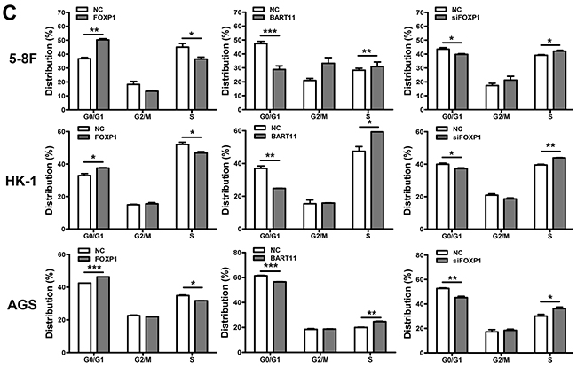 Figure 5: Effect of EBV-miR-BART11 and FOXP1 on cancer cell proliferation. The effect of FOXP1 or EBV-miR-BART11 overexpression, or FOXP1 siRNA knockdown (siFOXP1) on cell proliferation was investigated by the A. MTT assay and B. colony formation assay in 5-8F, HK-1, and AGS cells. C. Cell cycle analysis of cell cycle progression by flow cytometric analysis. All data were normalized to the vector-only control cell proliferation rate, and the results are expressed as mean ± SD of the results obtained in three independent experiments (*p < 0.05; **p < 0.01; ***p < 0.001).