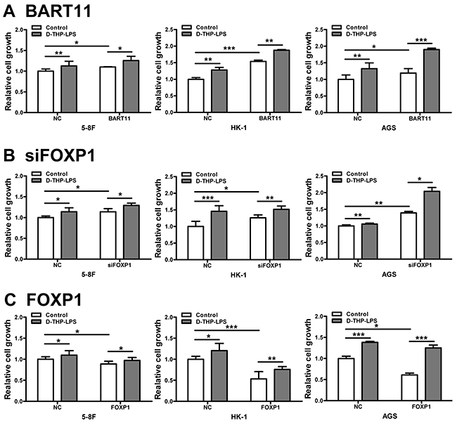 Figure 6: Effect of EBV-miR-BART11 and FOXP1 on inflammation-induced cancer cell proliferation. The proliferation of 5-8F, HK-1, and AGS cells transfected with EBV-miR-BART11 precursor vector A. FOXP1 siRNA B. or FOXP1 overexpression vector C. cultured in the conditioned media collected from LPS-treated differentiated THP-1 cells (D-THP-LPS). Data are expressed as mean ± SD of cell growth following different treatments, of three independent experiments. *p < 0.05; **p < 0.01; ***p < 0.001.