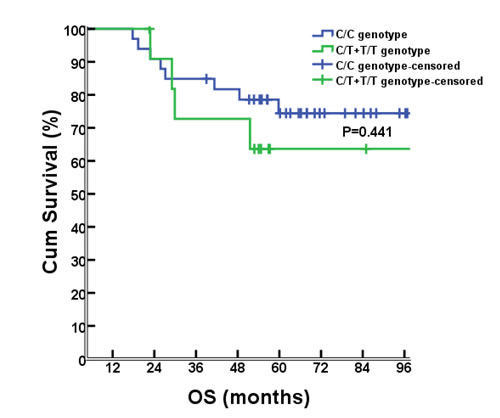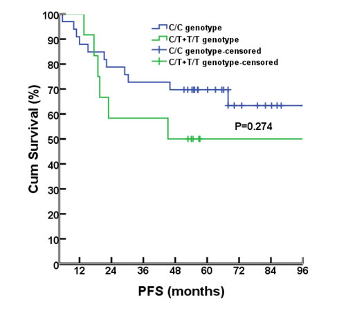 As of July 8, 2015, the median follow-up time was 56.8 months (range, 4.4-111.6 months). Survival analyses were performed for the 46 cases that had been successfully sequenced for rs1800925. Seventeen of them had progressed diseases, 1 with liver metastases, 8 with lung metastases, 1 with concurrent liver and lung metastases, 2 with pelvic relapse, 1 with outside regional lymph nodes metastases, 1 with concurrent pelvic relapse and outside regional lymph nodes metastases, 2 with multiple bone metastases, and 1 with brain metastases. There were 12 deaths (11 dying of cancer itself, 1 dying of primary liver cancer). There were no differences between C/C and T/T+C/T genotype groups for the 6-year rate of PFS (67.6% vs. 50%, P= 0.274; Figure 2) or OS (76.5% vs. 66.7%, P= 0.441; Figure 3).