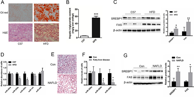 Figure 1: The levels of miR-200b and miR-200c are reduced in the steatotic livers of NAFLD patients and mice fed a HFD. (A) Oil red O and H&E staining of the livers of HFD-fed mice. (B) The measurement of triglyceride levels in the livers of HFD-fed mice. (C) Western blots showing the expression of the lipogenic proteins SREBP1 and FAS. (D, F) Real-time reverse-transcription PCR showing the relative expression patterns of miR-200 family members including miR-200b, miR-200c, miR-200a, miR-141 and miR-429 in the steatotic livers of HFD-fed mice (n = 5) or in the livers of NAFLD patients and healthy subjects (n = 11). (E) H&E staining of the livers of NAFLD patients. (G) Western blots showing the expression of SREBP1 and FAS in the livers of NAFLD patients. The data represent the mean ± SEM. *P < 0.05 and **P < 0.01 versus the control. The bar represents 25 μm.