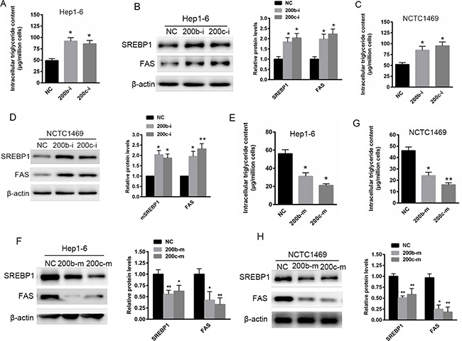 Figure 2: Reduced miR-200b and miR-200c expression contributes to abnormal lipid accumulation in Hep1-6 and NCTC1469 cells. (A, B) The measurement of triglyceride levels in Hep1-6 and NCTC1469 murine liver cells transfected with miR-200b and miR-200c inhibitors. (C, D) Western blots showing the expression of SREBP1 and FAS in Hep1-6 and NCTC1469 cells transfected with miR-200b and miR-200c inhibitors. (E, F) The measurement of triglyceride levels in Hep1-6 and NCTC1469 cells transfected with miR-200b and miR-200c mimics. (G, H) Western blots showing the expression of SREBP1 and FAS in Hep1-6 and NCTC1469 cells transfected with miR-200b and miR-200c mimics. The data represent the mean ± SEM of three independent experiments. *P < 0.05 and **P < 0.01 versus the control.