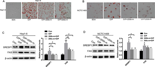Figure 3: The over-expression of miR-200b and miR-200c reverses oleic acid/palmitic acid-induced lipid accumulation in hepatocytes. (A, B) Oil red O staining of Hep1-6 and NCTC1469 cells pre-treated with a mixture of oleic acid/palmitic acid (2:1, M/M) for 24 h. (C, D) Western blots showing the expression of SREBP1 and FAS in Hep1-6 and NCTC1469 cells pre-treated with a mixture of oleic acid/palmitic acid (2:1, M/M) for 24 h and then transfected with miR-200b and miR-200c mimics. The data represent the mean ± SEM of three independent experiments. *P < 0.05 and **P < 0.01 versus the control; #P < 0.05 and ##P < 0.01 versus O/P. The bar represents 10 μm.