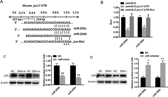 Figure 4: miR-200b and miR-200c bind to the 3′UTR of jun. (A) TargetScan-predicted miR-200b and miR-200c bind to the 3′UTR of jun. (B) The luciferase reporter assay used to determine the effects of miR-200b and miR-200c on the relative luciferase activity of pmirGLO-jun-3′UTR. (C) Western blots showing the expression of the JUN protein in Hep1-6 cells transfected with miR-200b and miR-200c mimics. (D) Western blots showing the expression of the JUN protein in Hep1-6 cells transfected with miR-200b and miR-200c inhibitors. The data represent the mean ± SEM of three independent experiments. *P < 0.05 and **P < 0.01 versus the control.