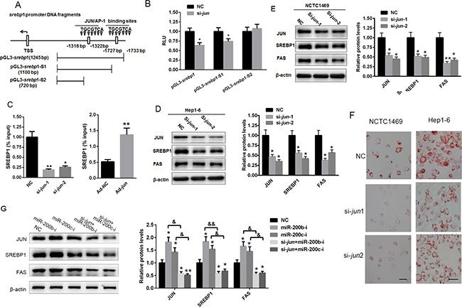 Figure 5: JUN activates lipid accumulation by activating the transcription of srebp1. (A) Schematic analysis of the potential JUN binding sites in the promoter region of murine srebp1 gene. (B) Results of the luciferase reporter assay conducted in HEK293T cells co-transfected with siRNA specifically inhibiting jun (si- jun-1 or si- jun-2) and a luciferase reporter plasmid containing the promoters of either srebp1 (pGL3-srebp1), srebp1-S1 (pGL3- srebp1-S1) or srebp1-S2 (pGL3- srebp1-S2). (C) A srebp1 ChIP assay was performed in Hep1-6 cells transfected with si- jun/NC (upper panel) or ad- jun/N C (lower panel) for 48 h. (D, E) Western blot analysis of SREBP1 and FAS expression in Hep1-6 and NCTC1469 cells transfected with si-jun-1 or si-jun-2. (F) Oil red O staining of Hep1-6 and NCTC1469 cells transfected with si-jun-1 or si-jun-2. (G) Western blot analysis of SREBP1 and FAS protein levels in Hep1-6 cells co-transfected with si-jun-1 and either the miR-200b inhibitor or the miR-200c inhibitor. The data represent the mean ± SEM of three independent experiments. *P < 0.05 and **P < 0.01 versus the control; &P < 0.05 and &&P < 0.01 versus the miR-200b inhibitor or the miR-200c inhibitor. The bar represents 10 μm.