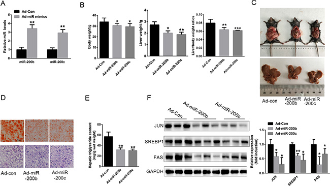 To determine whether miR-200b and miR-200c are involved in hepatic lipid accumulation in vivo, miR-200b and miR-200c were over-expressed in the livers of HFD-fed mice through the use of recombinant adenovirus expressing miR-200b and miR-200c mimics (Ad-miR-200b & Ad-miR-200c), respectively. Seven days after administration of Ad-miR-200b and Ad-miR-200c to the mice by tail vein injection, the hepatic levels of miR-200b and miR-200c were elevated by 3.43- and 2.93-fold, respectively (Figure 6A). More importantly, this enhancement of hepatic miR-200b and miR-200c expression led to a significant reduction in liver weight and in the liver weight-to-body weight ratio (Figure 6B, 6C). H&E and Oil Red O staining revealed decreased hepatic lipid deposition in these animals (Figure 6D). Of note, the hepatic triglyceride content was significantly reduced (Figure 6E), and this was associated with decreased levels of JUN, SREBP-1 and FAS protein in the liver (Figure 6F). These results suggest that the up-regulation of miR-200b and miR-200c expression in the liver may prevent the accumulation of hepatic triglycerides in HFD-fed mice by suppressing JUN-SREBP1-stimulated lipogenesis.