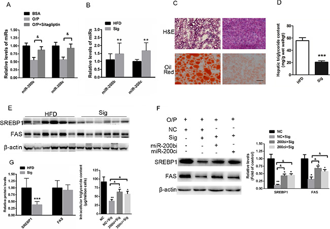 Figure 7: Elevated miR-200b and miR-200c expression is associated with sitagliptin-reduced hepatic lipid accumulation in mice fed a HFD. (A) Real-time reverse-transcription PCR analysis of miR-200b and miR-200c expression in Hep1-6 cells pre-treated with a mixture of oleic acid/palmitic acid (2:1, M/M) for 24 h and then treated with 1 μM sitagliptin for 24 h. (B) Quantification of miR-200b and miR-200c in the livers of HFD-fed mice treated with sitagliptin. (C) Oil red O staining and H&E staining of the livers of HFD-fed mice treated with 3 mg/kg/day sitagliptin via i.g. for 8 weeks. (D) Measurement of hepatic triglyceride content in HFD-fed mice treated with sitagliptin. (E) Western blot analysis showing the expression of SREBP1 in the livers of sitagliptin-treated mice fed a HFD. (F, G) Western blot analysis showed that inhibition of miR-200b and miR-200c could partially rescue sitagliptin-induced reduced levels of SREBP1 and FAS, and decreased contents of intracellular triglyceride in Hep1-6 cells. The data represent the mean ± SEM, n = 6 mice or n = 3 independent experiments. *P < 0.05 and **P < 0.01 versus the control; & P < 0.05 versus NC+Sig. The bar represents 25 μm.