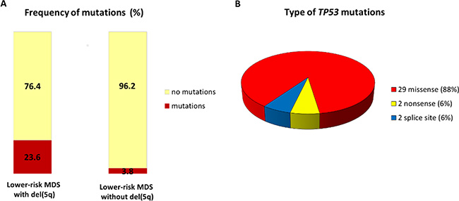 In the present study, we collected a well characterized cohort of lower-risk MDS patients and used NGS for mutation screening of the TP53 gene. We found that mutations in the TP53 gene were more common in lower-risk MDS patients with del(5q) than in those without a deletion (23.6% vs. 3.8%, respectively). However, the causes of the association between mutations in TP53 and del(5q) have not been explained yet.