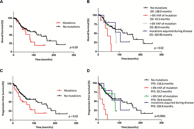 The third group included five patients who acquired mutations during the disease course at a median of 31.4 months after diagnosis (range: 18.6–48 months) and one patient with low VAF at 8.75 years from diagnosis and who had no available sample from the time of diagnosis (Figure 4C). All the patients in this group were treated with LEN. Mutations were detected in four patients prior to treatment (ID 373, 272, 1098, 1411) and in two patients after treatment with LEN (ID 1043, 496). Three patients who received LEN after identification of a mutation with VAF > 6% died. Six different mutations were detected in one patient (ID 1411) after 19 months of treatment; only one mutation had a high VAF, and the remaining 5 mutations had a VAF below 5%. This patient has not experienced disease progression. The remaining two patients with mutations detected after the administration of LEN are alive. In the first patient (ID 496), two mutations were detected after one year of treatment, and the third mutation was subsequently detected; all these mutations had low-level frequencies below 5%. The second patient (ID 1043) had one mutation detected after 3 months of treatment; the mutation level gradually increased up to 40% without progression.