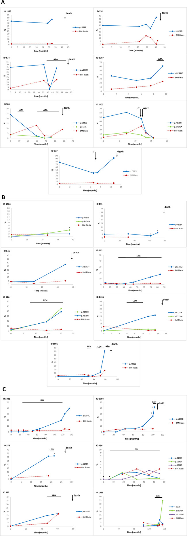 Figure 4: Time course of the TP53 mutant allele burden in serial follow-up samples of lower-risk MDS. The frequency of TP53 mutations during follow-up of individual patients stratified by the mutational burden and the time of mutation acquisition. (A) The first group of patients with VAF > 6% at the time of diagnosis; (B) the second group with VAF < 6% at the time of diagnosis; (C) the third group of patients who acquired a mutation in the course of the disease. Abbreviations: LEN, lenalidomide treatment; AZA, 5-azacytidine treatment; IT, induction therapy; HSCT, hematopoietic stem cell transplantation; *, examinations performed from peripheral blood; %, % of variant allele frequency.