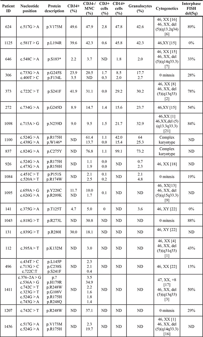 Protein p53 is a tumor suppressor and a transcription factor that responds to DNA damage by regulating various pathways, such as apoptosis, DNA repair, senescence and cell-cycle arrest. Somatic mutations in the TP53 gene are one of the most common alterations in human cancers. TP53 mutations in MDS have been described mostly in higher-risk groups, and they are associated with a complex karyotype and therapy-related MDS [8, 9]. The incidence of TP53 mutations in lower-risk MDS patients has been evaluated in several studies: 2% in lower-risk MDS patients, as described by Bejar [10], 3% in lower-risk MDS patients and 19% in MDS patients with isolated del(5q), as reported by Kulasekararaj [11], and 18% in low-risk MDS patients with del(5q) in a study by Jädersten et al. [12].