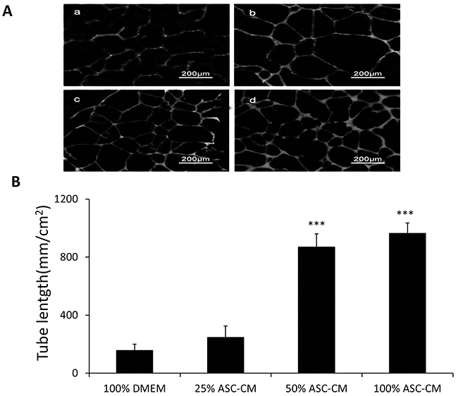 Figure 1: ASC-CM stimulated capillary network formation by HUVEC in Matrigel. HUVECs suspended in Matrigel were subjected to different doses of ASC-CM treatments or DMEM and analyzed for capillary network formation after 48 hours. A. Representative images demonstrating capillary network formation of HUVECs in Matrigel media. a: 100% DMEM; b: 25% ASC-CM in DMEM; c: 50%ASC-CM in DMEM; d: 100 % ASC-CM. B. Capillary networks were stained and analyzed as described in Methods. Data of tube length represent mean ± SD of three independent experiments. N=3, *** p<0.001 compare with 100% DMEM.