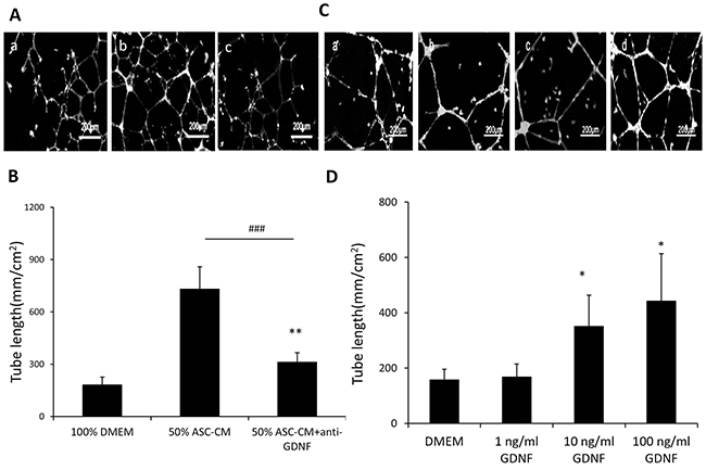 Figure 2: GDNF in ASC-CM and recombinant protein stimulated the network formation of HUVECs in Matrigel. A. GDNF antibody inhibited ASC-CM-stimulated capillary network formation. Representative images demonstrating the tube network formation of HUVECs in Metrigel. a: 100% DMEM; b: 50% ASC-CM c: 50% ASC-CM+GDNF antibody. The tube length in three wells of each treatment was compared to those without ASC-CM treatments (total length ± SD). **: p<0.01, ***: p<0.001, compared with the group of 100% DMEM. B. GDNF stimulated the network formation of HUVECs in Matrigel. Representative images demonstrating the tube network formation of HUVECs in Matrigel. a: DMEM; b: DMEM+ 1ng/ml GDNF; c: DMEM+ 10ng/ml GDNF; d: DMEM+ 100ng/ml GDNF. Analysis was performed at 48 hours following ASC-CM treatments. Data of tube length represent mean ± SD of three independent experiments. N=3, *: p<0.05, compared with the group of DMEM.