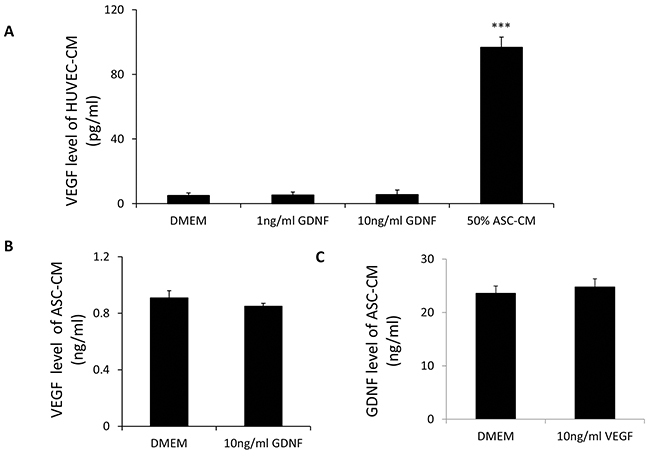 Figure 5: A, B. GDNF treatments did not stimulate VEGF secretion in HUVECs and ASC. 24-hour treatments of GDNF at 10 ng/ml did not affect VEGF production in HUVECs and ASC. C. VEGF did not affect GDNF production in ASC. 10 ng/ml VEGF treatments did not affect GDNF production in ASC. Data represent mean ± SD of three independent experiments. N=3, ***: p<0.001, compared with the group of DMEM.