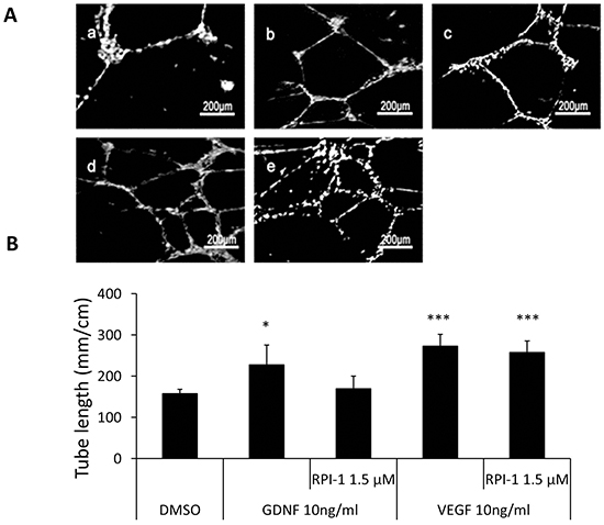 Figure 6: RPI-1, the inhibitor of the GDNF receptor (RET), affects GDNF, but not VEGF, induced HUVECs tube formation. A. Representative images demonstrating the tube network formation of HUVECs in Matrigel. a: control: DMSO; b: 10 ng/ml GDNF; c: 10 ng/ml GDNF+ 1.5 μM RPI-1; d: DMEM+ 10ng/ml VEGF; e: DMEM+ 10ng/ml VEGF+ 1.5 μM RPI-1. B. Analysis was performed at 48 hours following ASC-CM treatments. Data of tube length represent mean ± SD of three independent experiments. N=3, *: p<0.05, ***: p<0.001, compared with the control group of DMSO.
