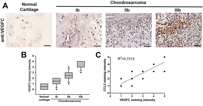 Figure 1: Clinical significance of CCL5 and VEGF-C expression in specimens of chondrosarcoma patients. A. Immunohistochemistry of VEGF-C expression in human normal cartilage and chondrosarcoma tissues. B&C. The quantitative data and correlation between CCL5 and VEGF-C as well as tumor stage. The representative specimens were shown, and the staining intensity was ranked into five groups (1-5) according to the histologic scoring. The correlation analyses were performed by Spearman rank correlation test (R2 > 0.5).