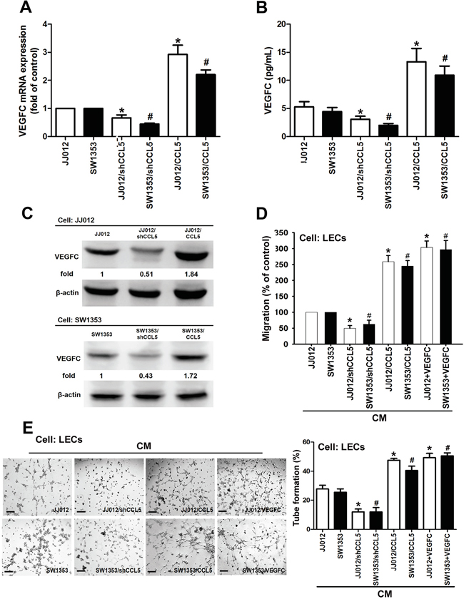 Figure 2: CCL5 promotes lymphangiogenesis by VEGF-C production in human chondrosarcoma cells. A-C. The JJ012/vector, JJ012/shCCL5, JJ012/CCL5, SW1353/vector, SW1353/shCCL5 and SW1353/CCL5 cells were cultured for 24 h, and VEGF-C expression was examined by qPCR, ELISA, and Western blot (n = 4-6). D&E. The medium was collected as CM, then applied to LECs for 6 h treatment. Then, cell migration and capillary-like structure formation in human LECs were examined by Transwell migration and tube formation assay. The CM of JJ012/vector and SW1353/vector cells were treated with VEGF-C (25 ng/ml), then used to induce LECs migration and tube formation (n = 4-6). Results are expressed as the mean ± SE. *, p < 0.05 compared with JJ012 control; #, p < 0.05 compared with SW1353 control.