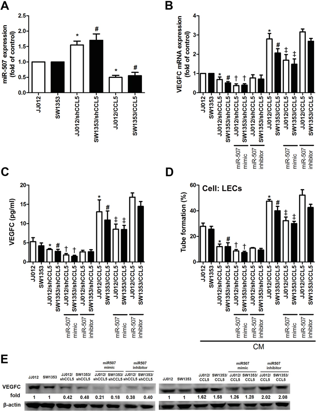 Figure 3: CCL5 promotes VEGF-C-dependent lymphangiogenesis by suppressing miR-507. The JJ012/vector, JJ012/shCCL5, JJ012/CCL5, SW1353/vector, SW1353/shCCL5 and SW1353/CCL5 cells cultured for 24 h, and miR-507 expression was examined by qPCR A. In addition, cells were transfected with miR-507 mimic or inhibitor for 24 h, and VEGF-C expression was examined by qPCR B. ELISA C. and Western blot E. (n = 5-7). The medium was collected as CM and then applied to LECs for tube formation assay D. (n = 5). Results are expressed as the mean ± SE. *, p < 0.05 compared with JJ012 control; #, p < 0.05 compared with SW1353 control; †, p < 0.05 compared with CCL5-knockdowned group; ‡, p < 0.05 compared with CCL5-overexpressed group.
