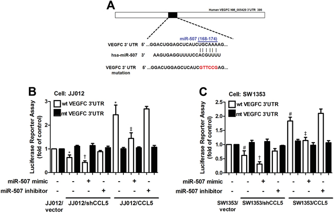 Figure 4: The miR-507 inhibits VEGF-C expression through binding to the 3′UTR of human VEGF-C. A. Schematic representation of the 3′UTR of the human VEGF-C containing a miR-507 binding site. B&C. Cells were cotransfected with miR-507 mimic or inhibitor and wt-VEGFC-3′UTR or mt-VEGFC-3′UTR plasmid for 24 h, and the relative luciferase/renilla activities were measured by luciferase reporter assay (n = 5). Results are expressed as the mean ± SE. *, p < 0.05 compared with JJ012 control; #, p < 0.05 compared with SW1353 control; †, p < 0.05 compared with CCL5-knockdowned group; ‡, p < 0.05 compared with CCL5-overexpressed group.