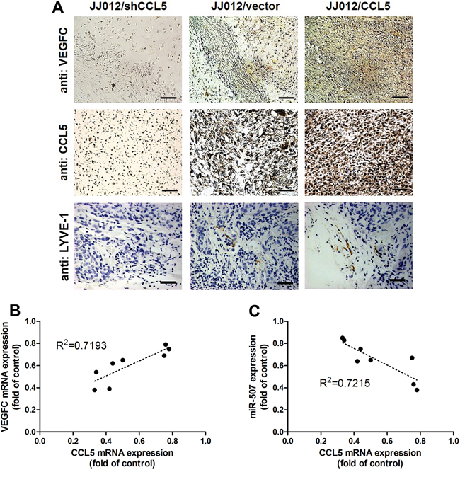 Figure 5: CCL5 promotes tumor lymphangiogenesis by suppressing miR-507 in vivo. The JJ012/vector, JJ012/shCCL5 and JJ012/CCL5 cells were mixed with Matrigel and injected into flank sites of mice (n = 8-10) for six weeks. Then, the xenografted tumors were excised and stained with CCL5, VEGF-C and LYVE-1 by IHC A. The correlation between CCL5/VEGF-C B. and CCL5/miR-507 C. in tumor tissues was analyzed by qPCR and Spearman rank correlation test (n = 8) (R2 > 0.5).