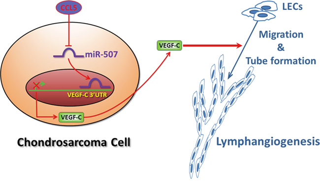 Although chondrosarcoma is a relatively rare human cancer, the notorious aggressiveness of chondrosarcoma is due to its metastatic potential and poor prognosis [3]. Lymphngiogenesis is an indispensable step for cancer metastasis, facilitating cancer development by the generation of new lymphatic vessels that serve as conduits for tumor dissemination to lymph nodes and beyond [4]. Accumulating evidences demonstrate that increased level of VEGF-C promotes tumor relapse and poor prognosis, and thus VEGF-C represents a potential target for preventing lymphatic metastasis [5, 13]. In the current study, we indicate the clinical significance of CCL5 and VEGF-C expression in specimens of chondrosarcoma patients. We reveal that CCL5 increases the production of lymphangiogenic factor VEGF-C by down-regulating miR-507 in chondrosarcoma cells, and thereby promotes tumor lymphangiogenesis in chondrosarcoma microenvironment (Figure 6). Recent studies have shown that chemokine/chemokine receptor system is directly or indirectly involved in promoting tumor lymphangiogenesis [5]. CXC chemokine ligand 12 (SDF-1) has been indicated to directly promote lymphangiogenesis in human LECs through the chemokine receptor CXCR4 [29]. Addtionally, CCL21/CCR7 chemokine axis regulates the expression and secretion of VEGF-C in human breast cancer cells, and contributes to LECs lymphangiogenesis and breast cancer-induced lymphangiogenesis [30]. Herein, we point out that CCL5/CCR5 axis induces VEGF-C-dependent lymphangiogenesis in human chondrosarcoma. Our study is the first to report that chemokine CCL5 induces lymphangiogenesis by the induction of VEGF-C in human cancer cells.