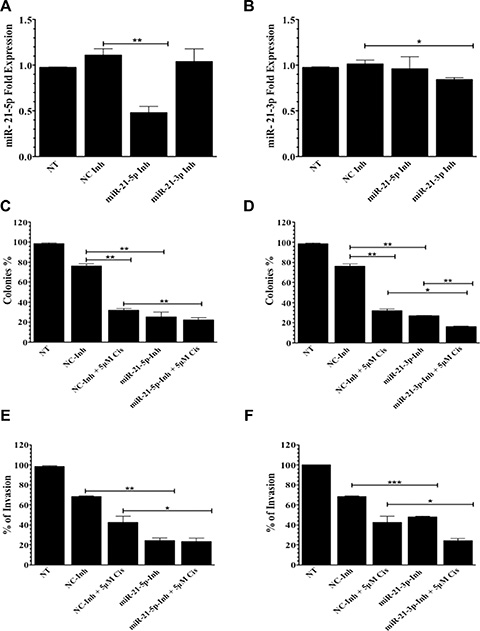 Figure 2: Colony formation and invasion assays in A2780CP20 cells. qPCR analysis of (A) miR-21-5p and (B) miR-21-3p after transfection with miR-21-5p-Inh or miR-21-3p-Inh, respectively. Colony formation assays of (C) miR-21-5p-Inh or (D) miR-21-3p-Inh transfected cells with and without 5 μM of cisplatin. Invasion assays of (E) miR-21-5p-Inh or (F) miR-21-3p-Inh transfected cells with and without 5 μM of cisplatin. Experiments were performed at least in triplicates. Columns represent the means ± SEM. *p ≤ 0.05, **p ≤ 0.01, and ***p ≤ 0.001.